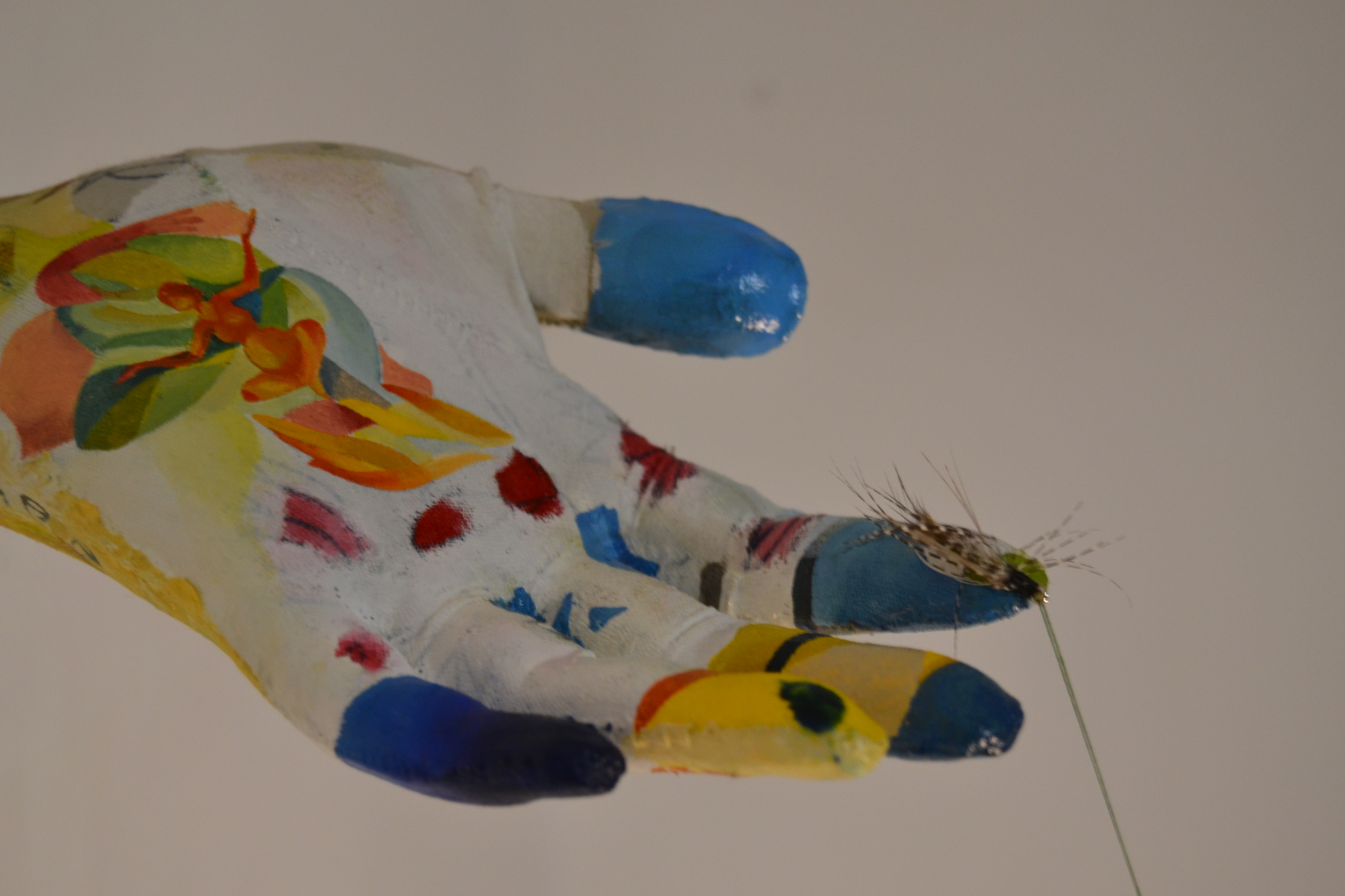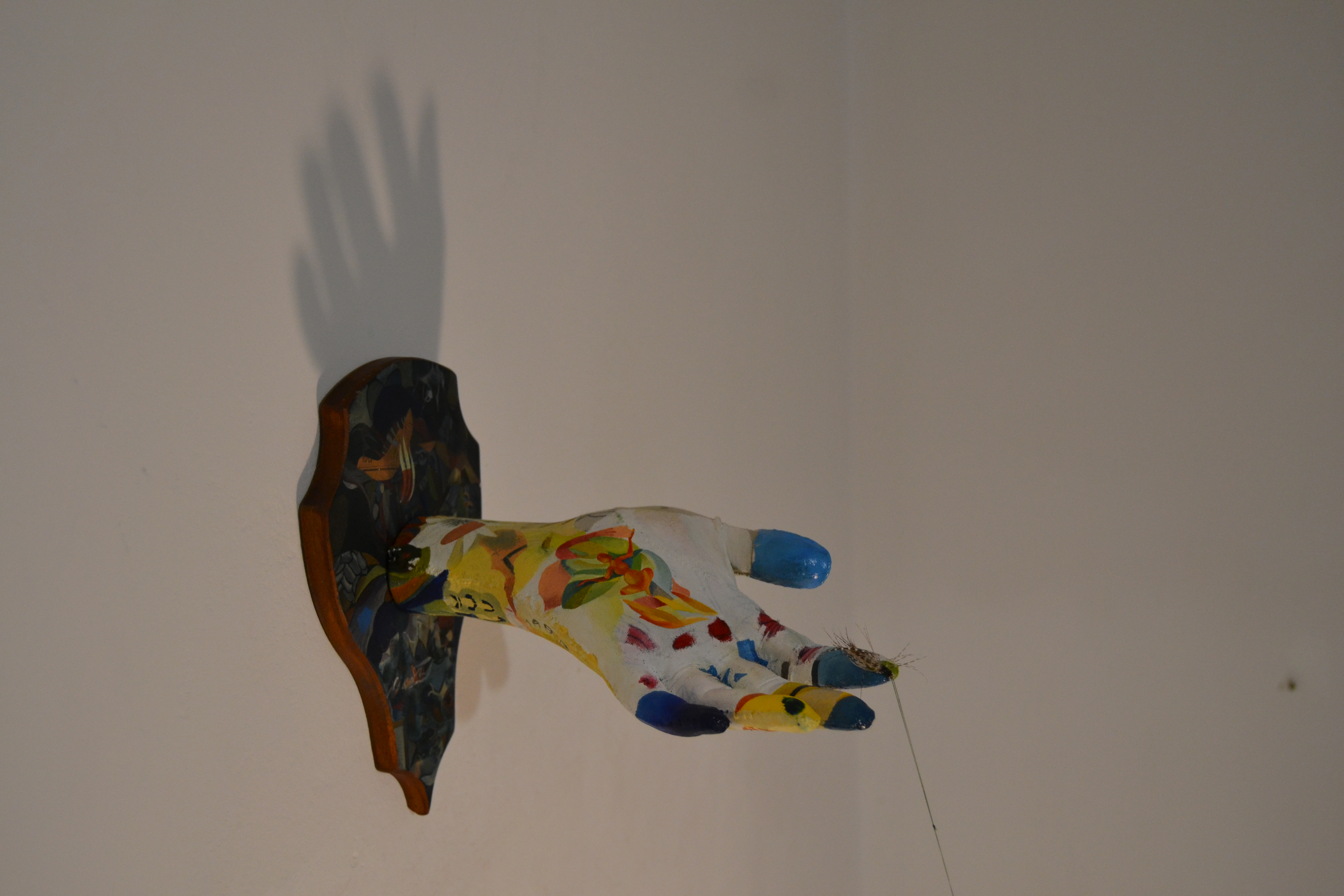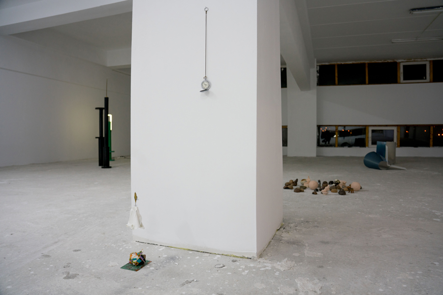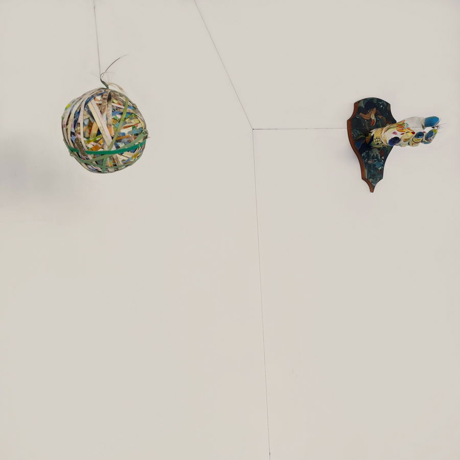 The installation “Pressure Points” contains a little history of my old, extinguished passions, taxidermy and fly fishing, sometime around `97, as well as a still-living passion for painting. I say “still alive” because at some point I started destroying certain paintings and turning them into yarns to use in the installation. The big yarn has the same weight as the plumb bob counterbalancing it. The plumb bob, on the other hand, denotes the technical side, the mathematics that I didn’t get rid of even in 12th grade for calculating the beams in the cutting force. All these inclinations translate into little time capsules that build the structure of an extremely fragile balance.
