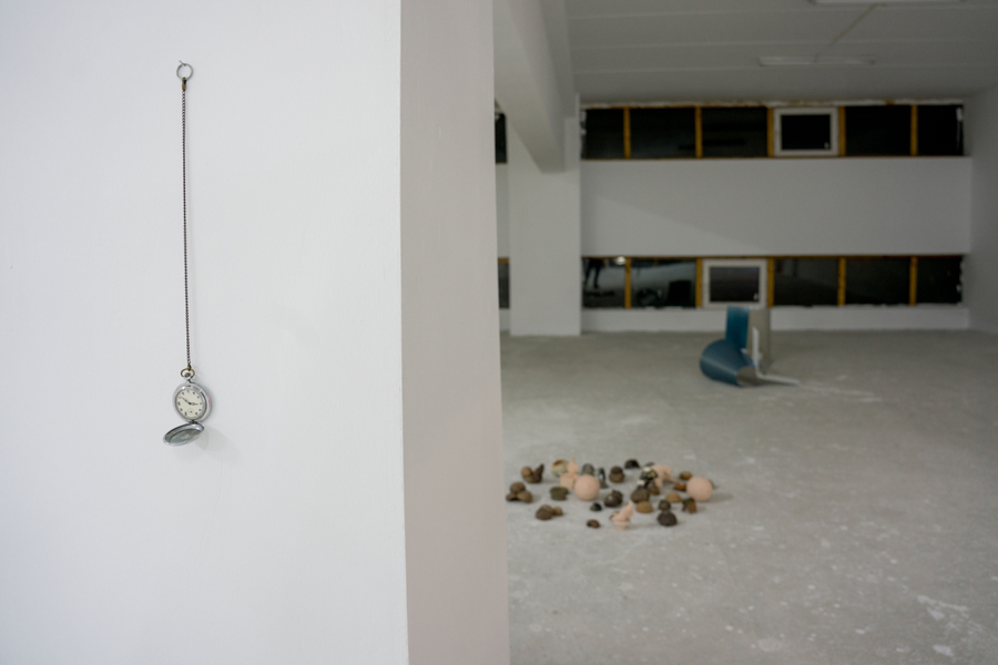 These elements construct a sculptural assemblage in which the pieces rely on each other to create an interconnected dependency. Unveiling the veil uncovers the codependent linkage between familial ties and genetic memory. The structure is extremely sensitive accentuating the tension that lies behind balanced relatedness. The clock, having approximately the same weight as the metallic rhombus, balances the traction of the fishing line, securing the stability of the caught cloth in the wobbler. “Pulling the rag” out of the water, it remains strained a few centimeters above the coupling seashells tangled in colorful threads, leaving traces of salted water upon a coppery plate. The pocket clock belonged to my grandfather, which he clung to have fixed for the second time because it stopped functioning. Unfortunately, the watchmaker could not make it work anymore, so now it serves as an object that I found in my vicinity to stop the rhomboid structure from pulling the fishing lure with its caught-up cloth.