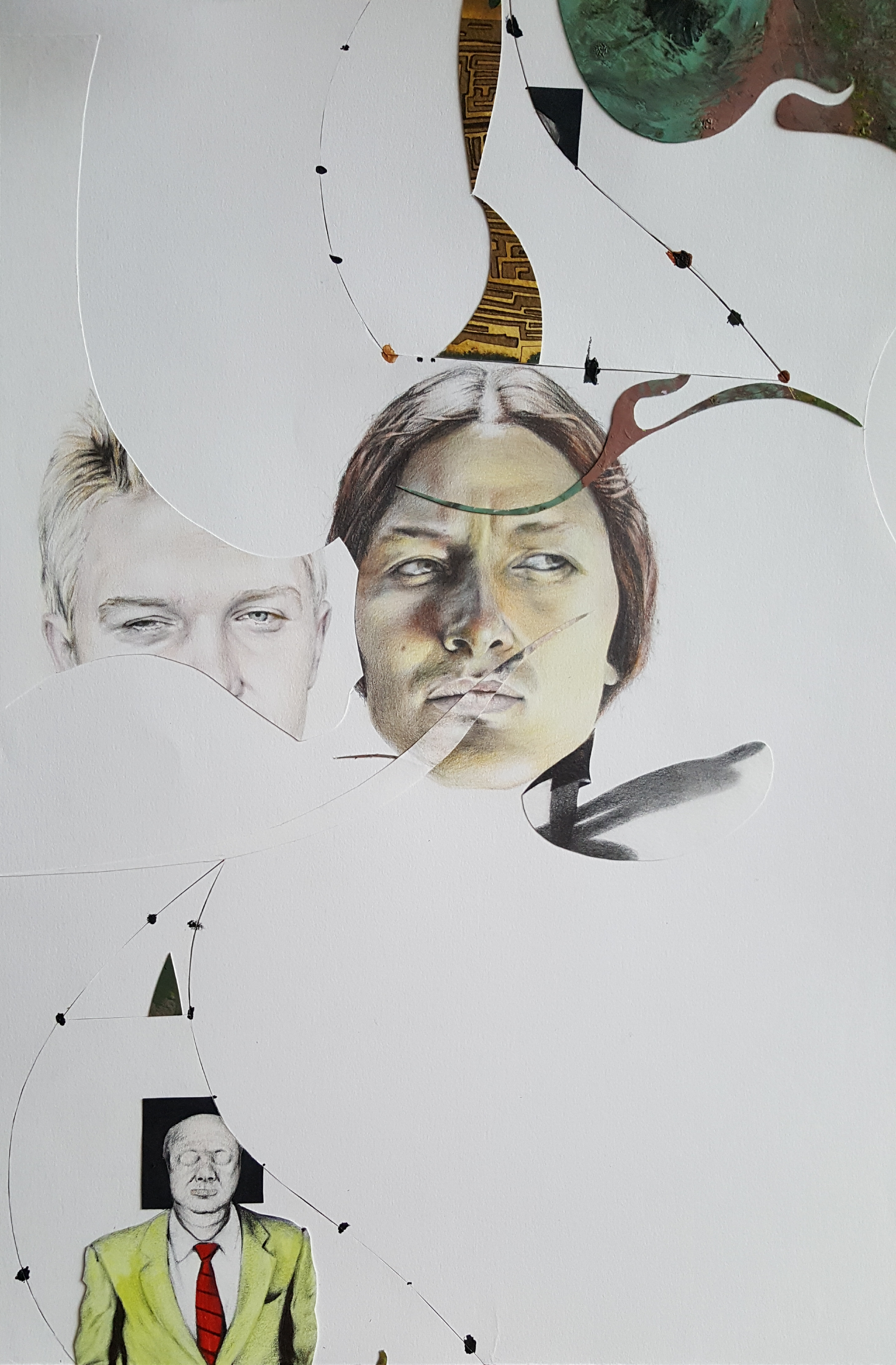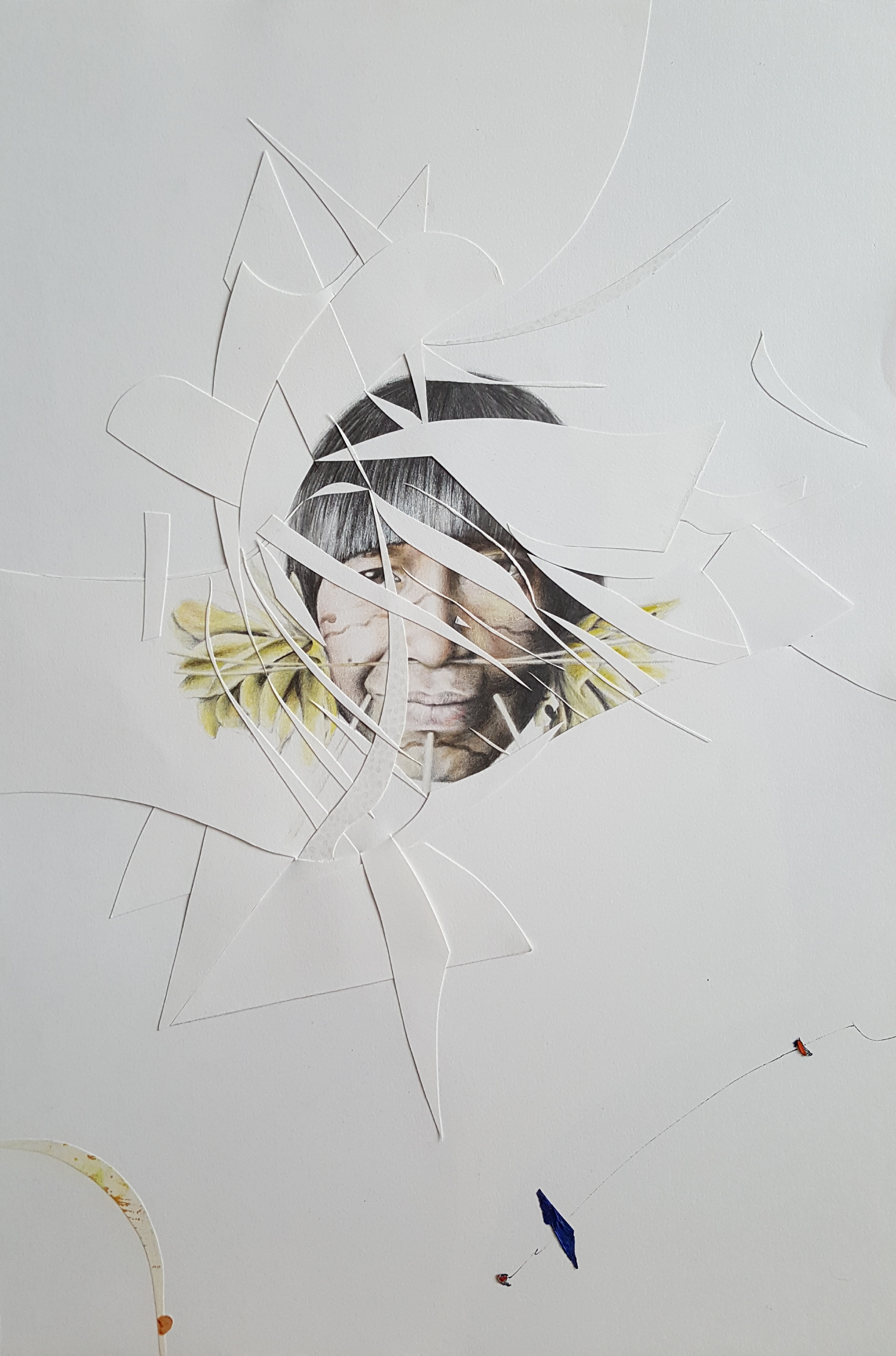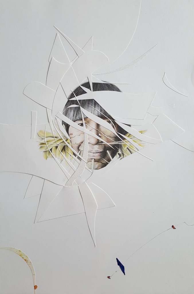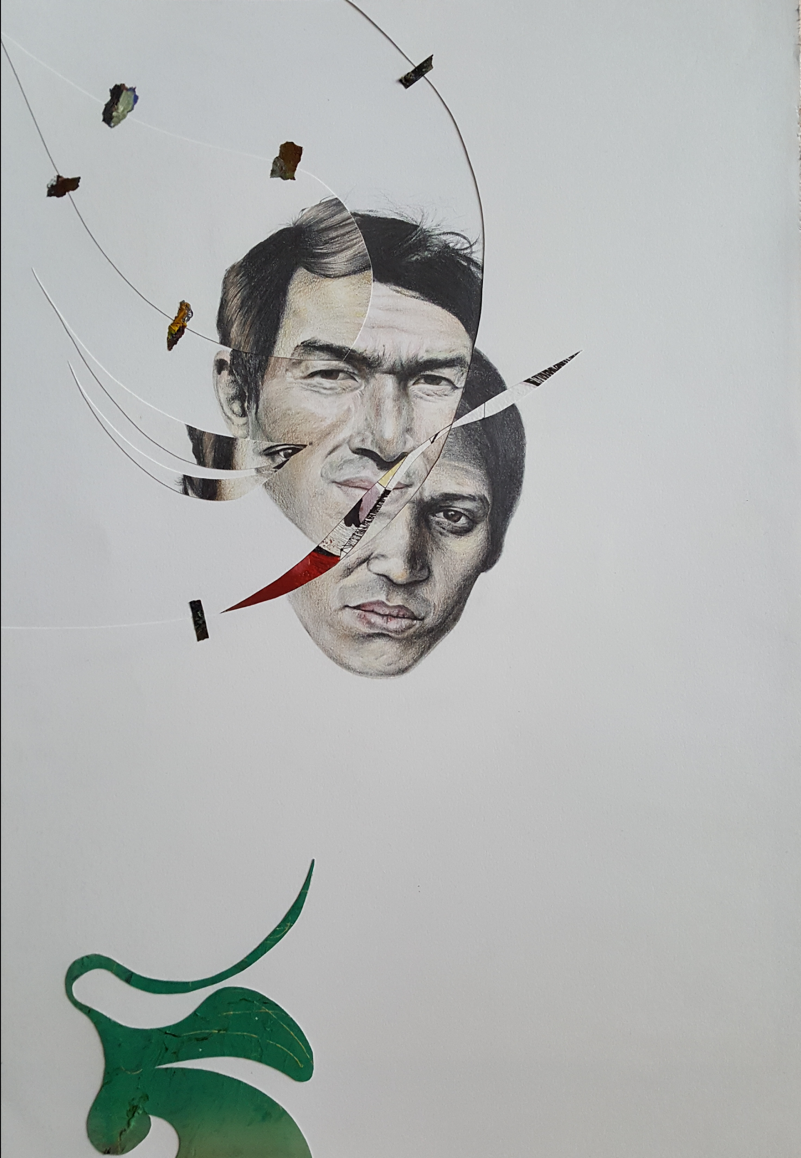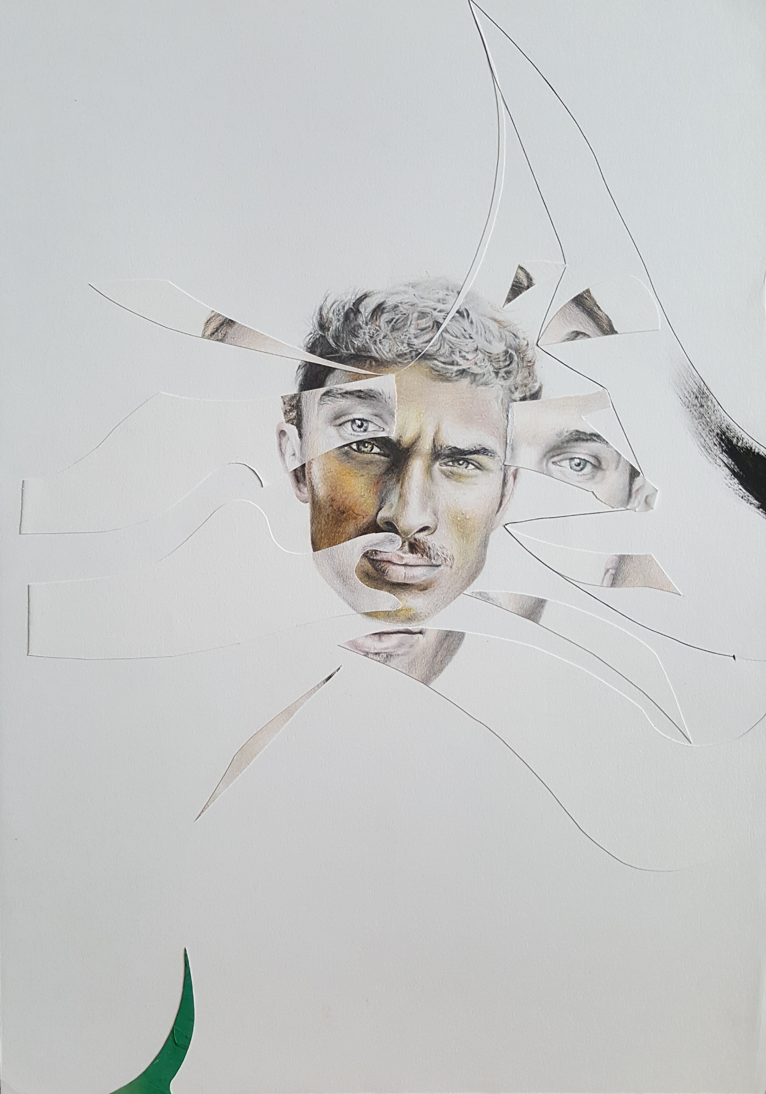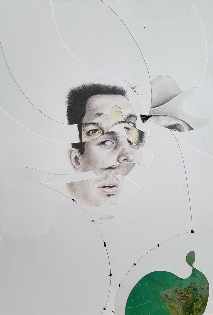 Six years after finishing the project, I came back and restructured it by cutting the finished pieces. It took some years to find the boldness to take this stance in sectioning most of the drawings. I displaced parts from other works to move the discourse towards the movement of the moment. To shed light on the product side of the work, I used different materials such as colored pencils, mechanical pencils, ball pens, thread, acrylic, ink, and sections of a destroyed oil painting. The creative practice is a reflection by which transformation occurs through the separation and assimilation of multiple components. The reason for this approach is to present an affirmative position towards change through a renewed act of union. The fitting of the individual subject into a collective is an ever-incomplete process and a never-ending becoming.