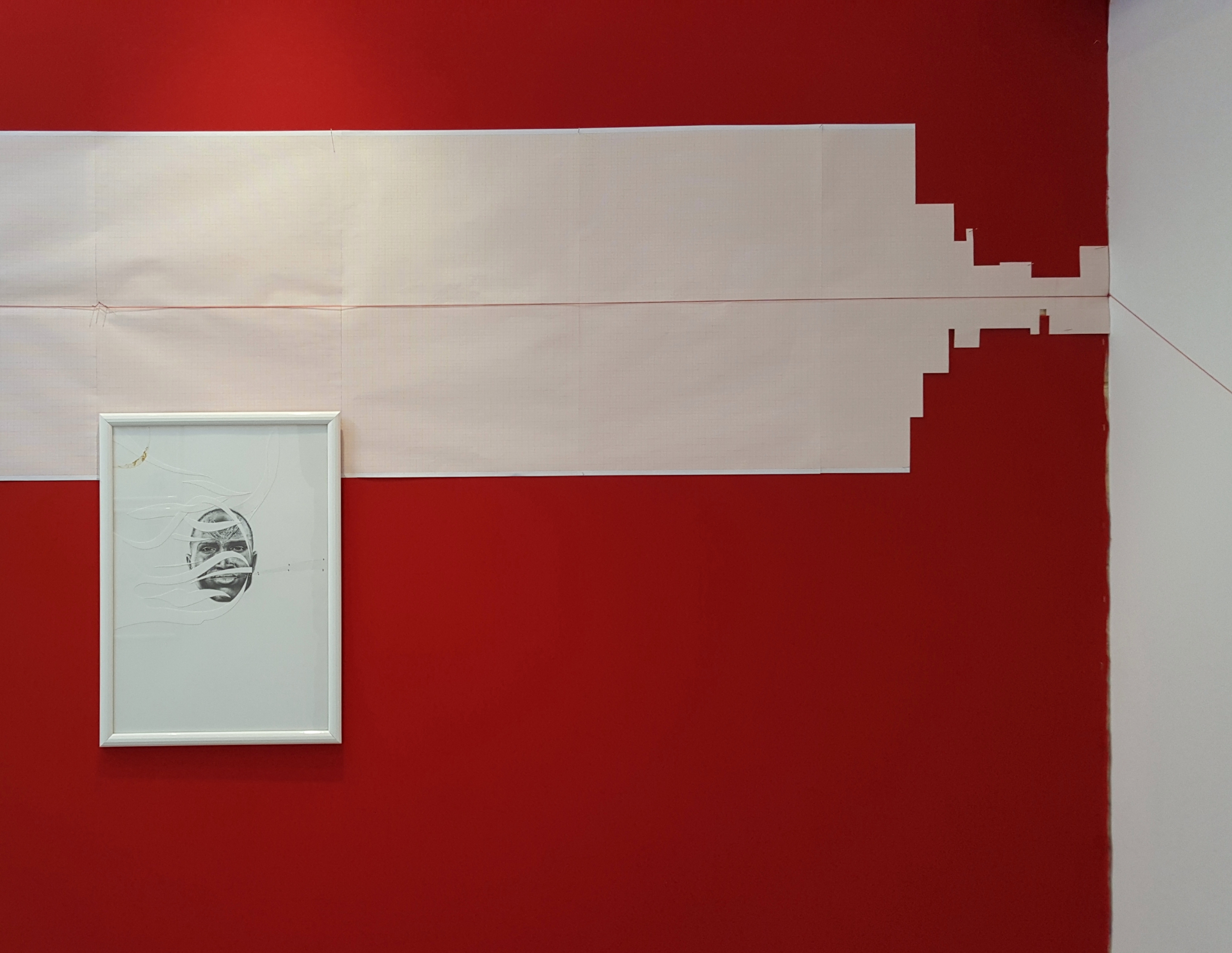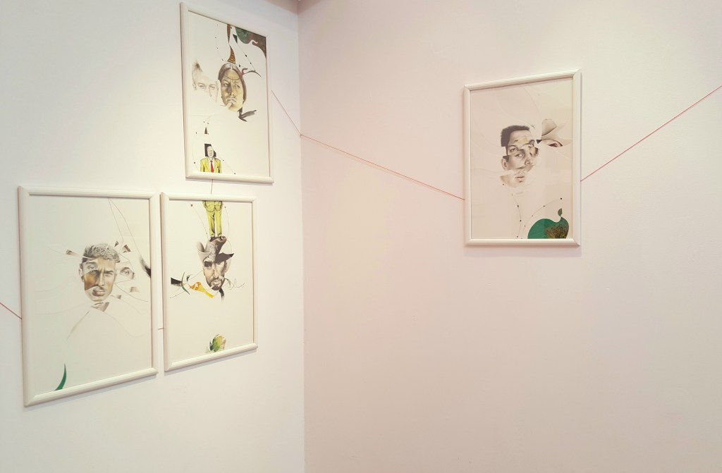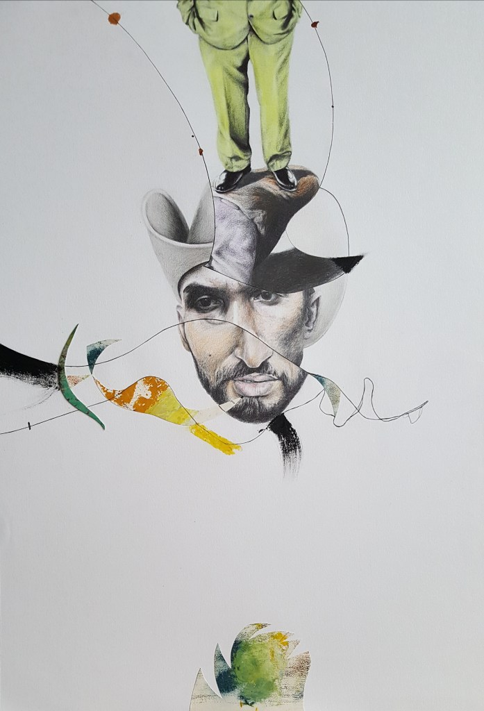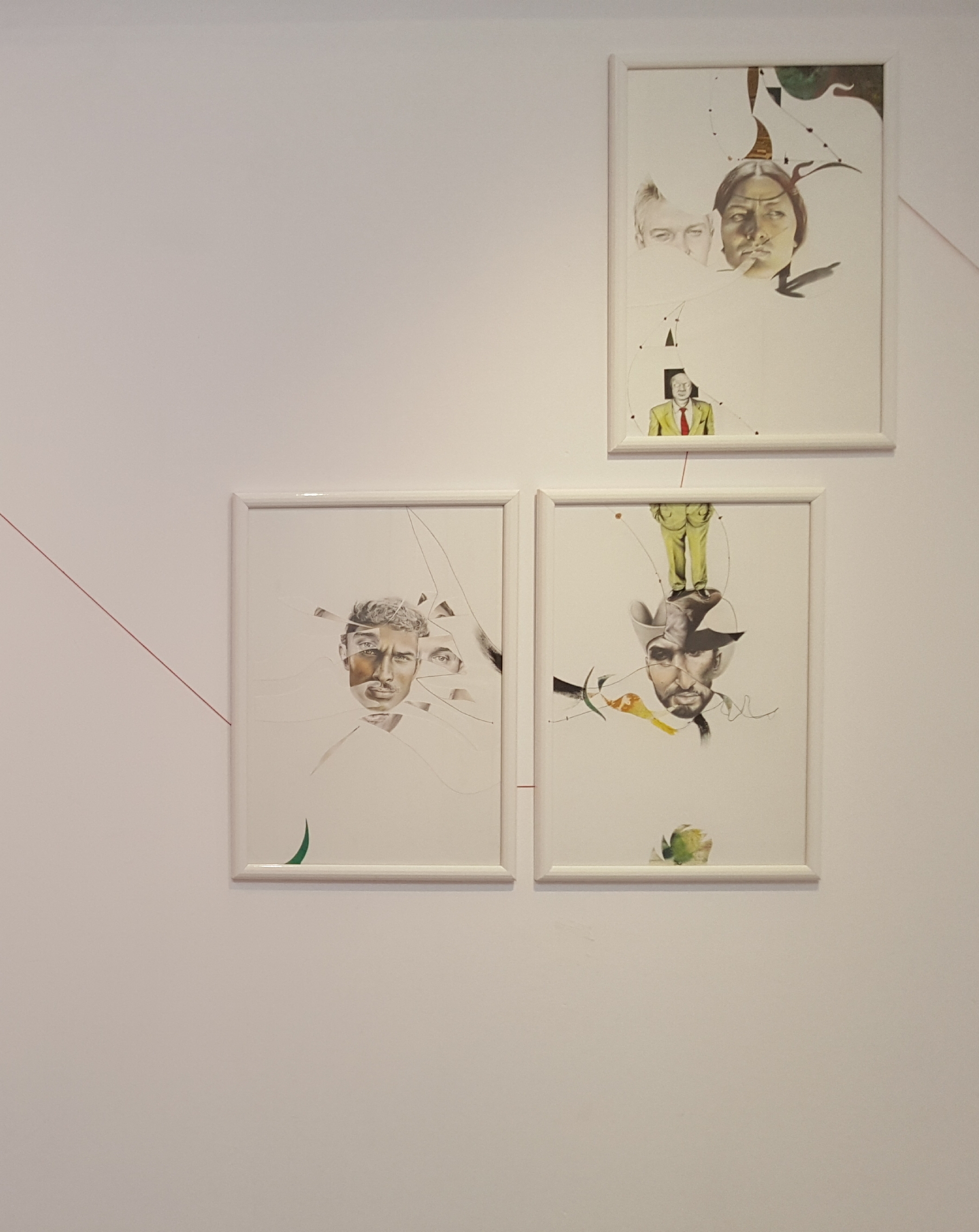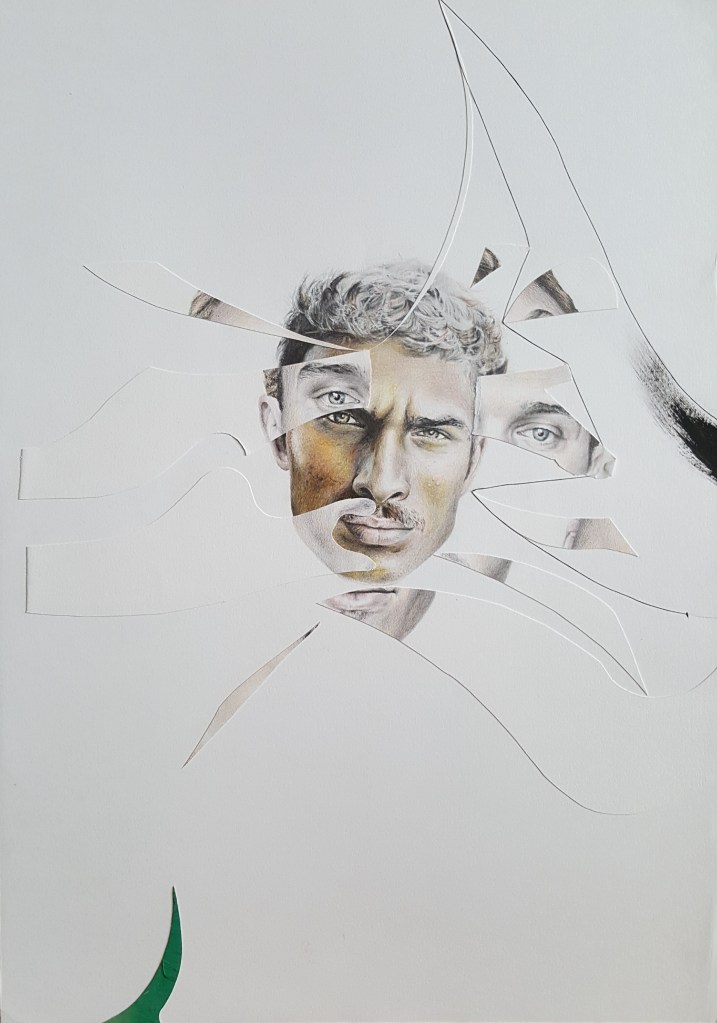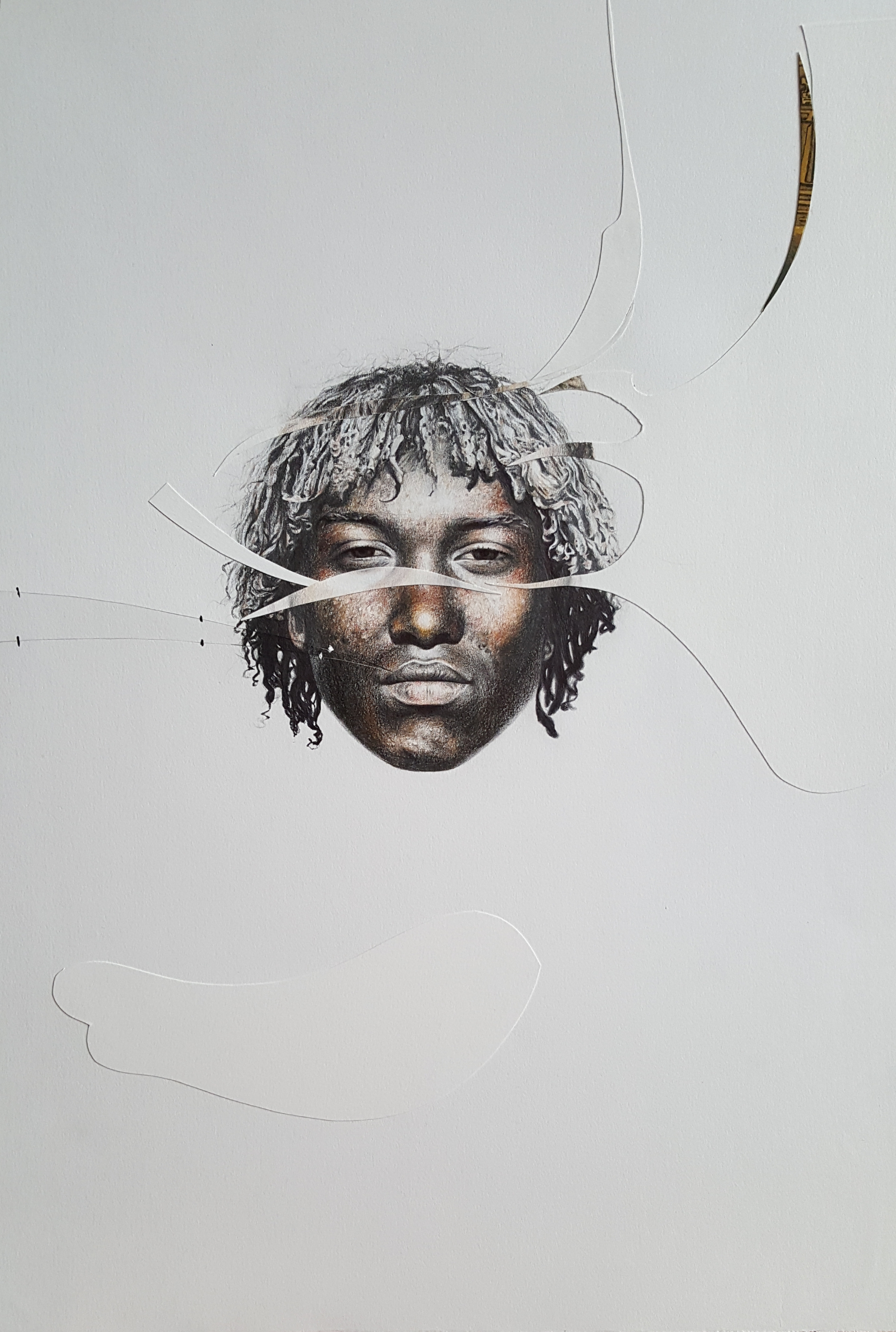 Six years after finishing the project, I came back and restructured it by cutting the finished pieces. It took some years to find the boldness to take this stance in sectioning most of the drawings. I displaced parts from other works to move the discourse towards the movement of the moment. To shed light on the product side of the work, I used different materials such as colored pencils, mechanical pencils, ball pens, thread, acrylic, ink, and sections of a destroyed oil painting. The creative practice is a reflection by which transformation occurs through the separation and assimilation of multiple components. The reason for this approach is to present an affirmative position towards change through a renewed act of union. The fitting of the individual subject into a collective is an ever-incomplete process and a never-ending becoming.