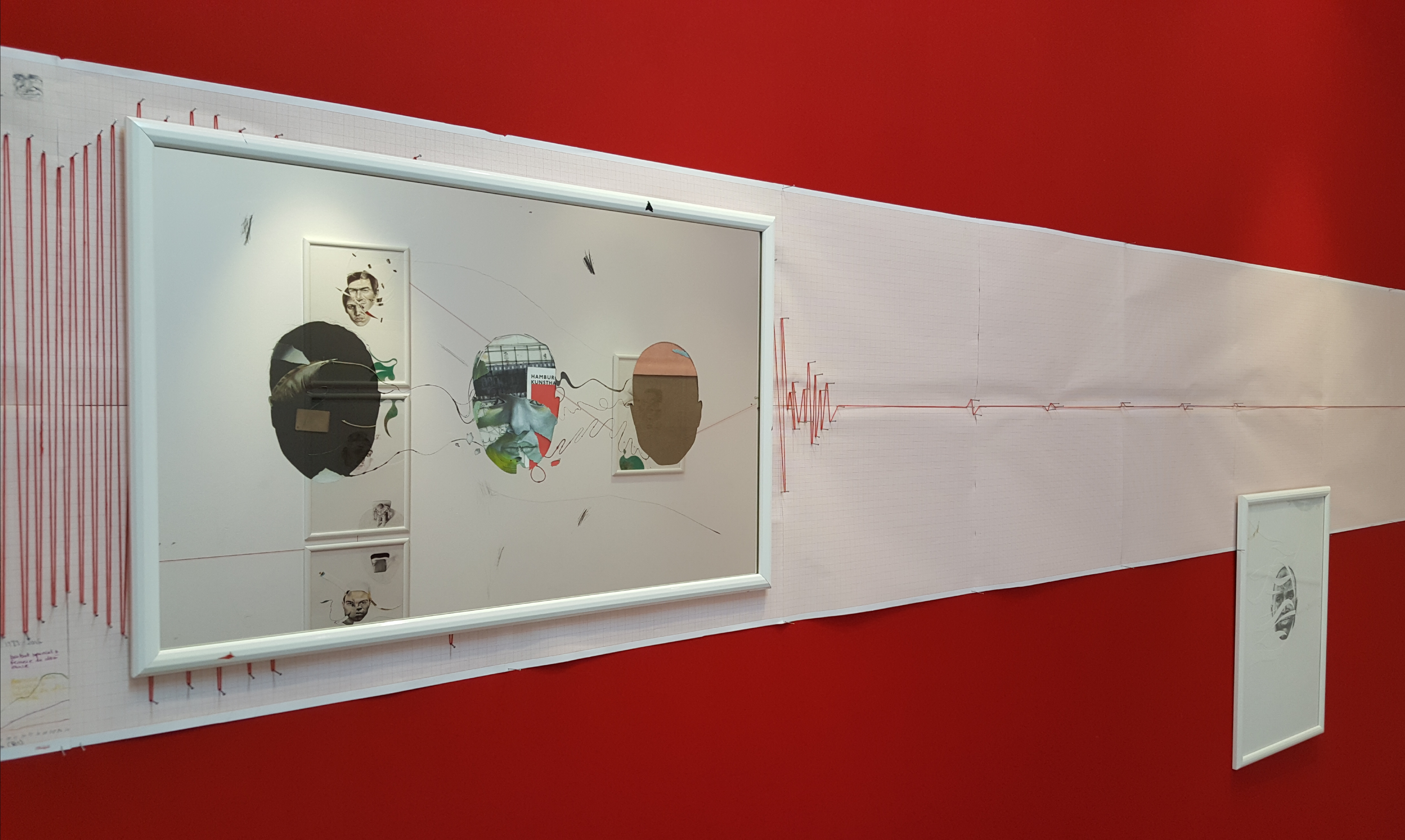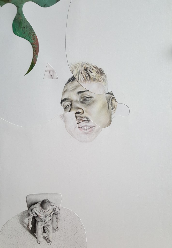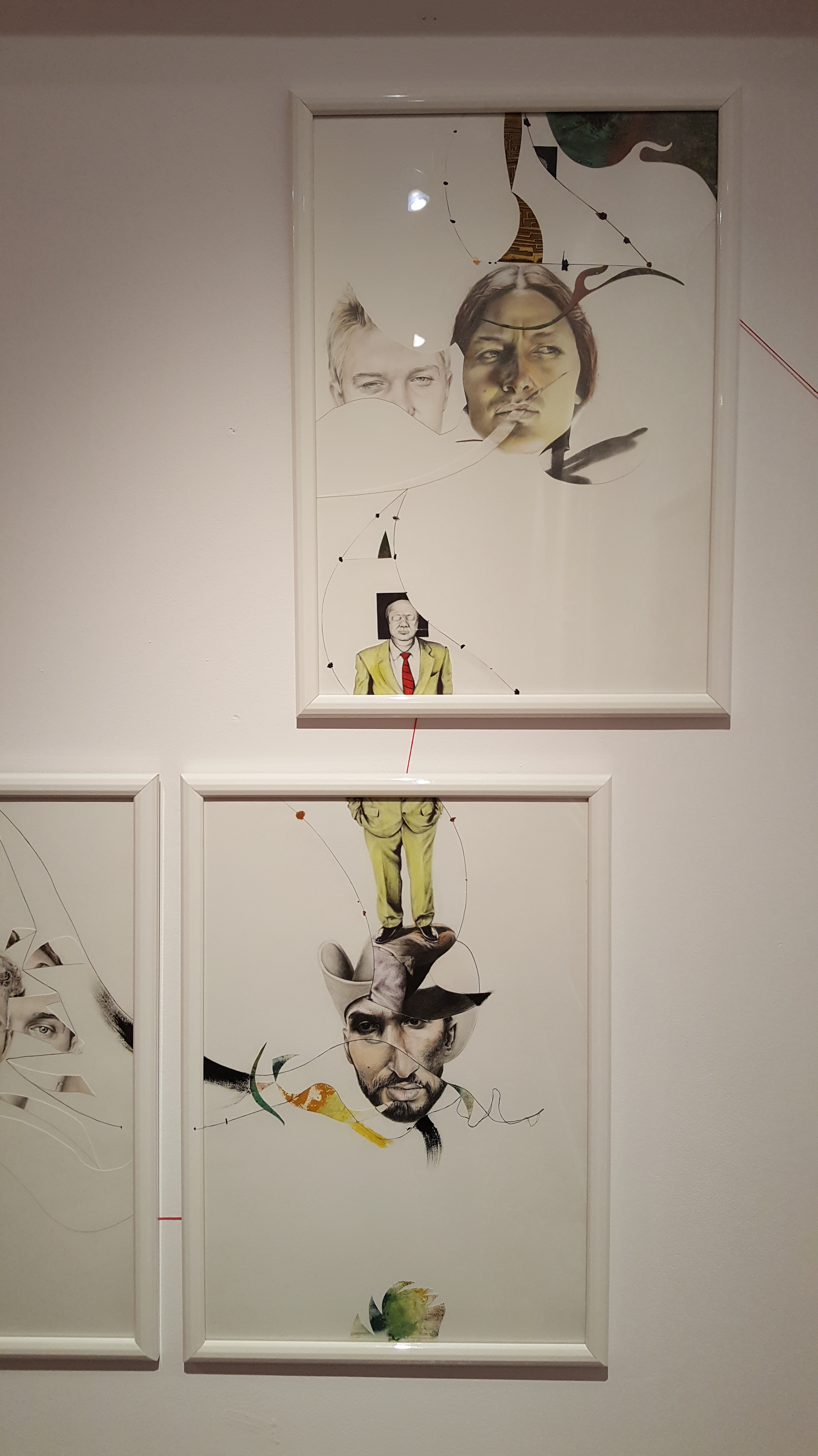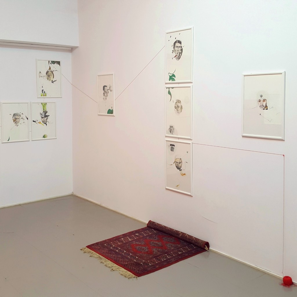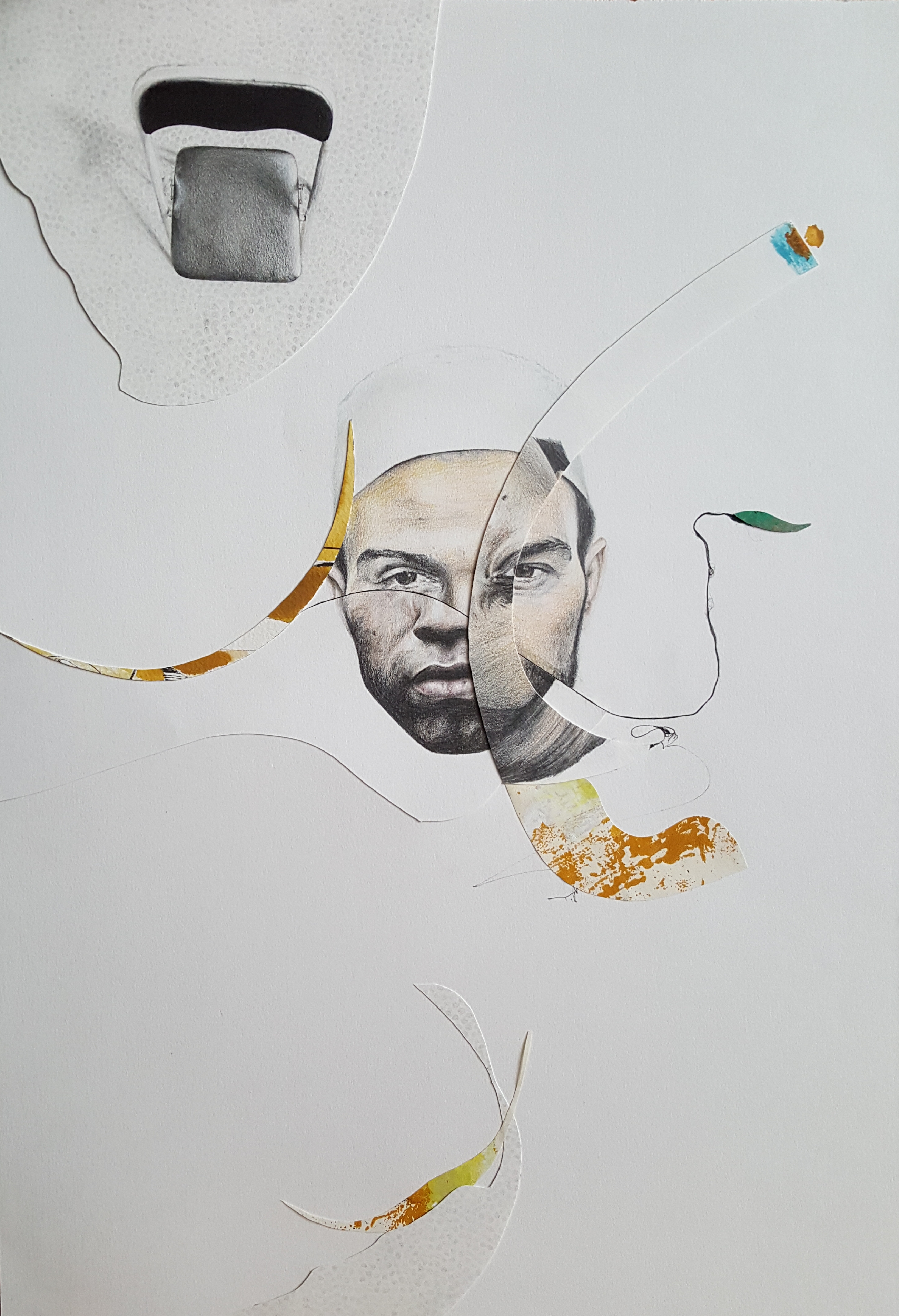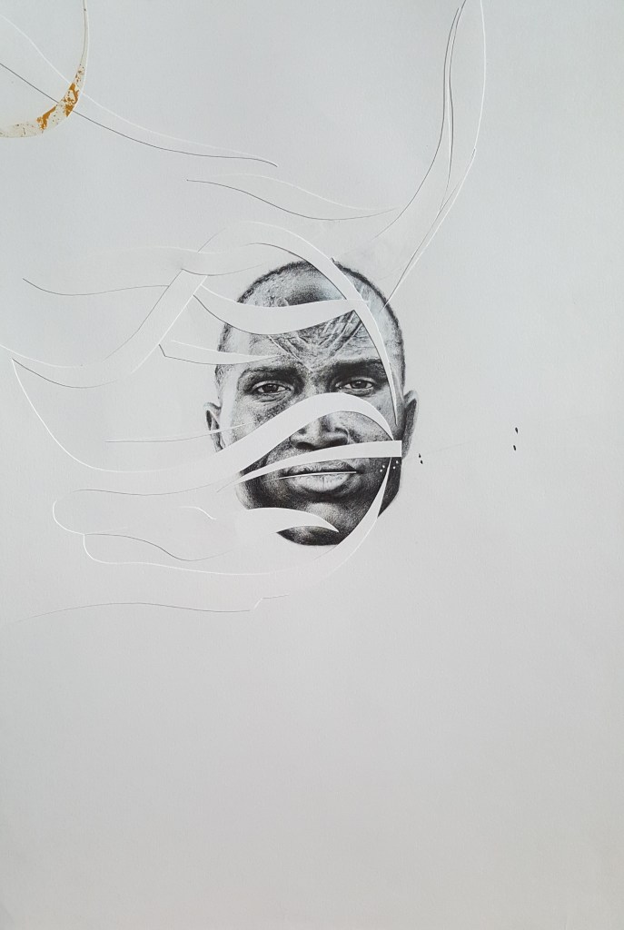 Six years after finishing the project, I came back and restructured it by cutting the finished pieces. It took some years to find the boldness to take this stance in sectioning most of the drawings. I displaced parts from other works to move the discourse towards the movement of the moment. To shed light on the product side of the work, I used different materials such as colored pencils, mechanical pencils, ball pens, thread, acrylic, ink, and sections of a destroyed oil painting. The creative practice is a reflection by which transformation occurs through the separation and assimilation of multiple components. The reason for this approach is to present an affirmative position towards change through a renewed act of union. The fitting of the individual subject into a collective is an ever-incomplete process and a never-ending becoming.