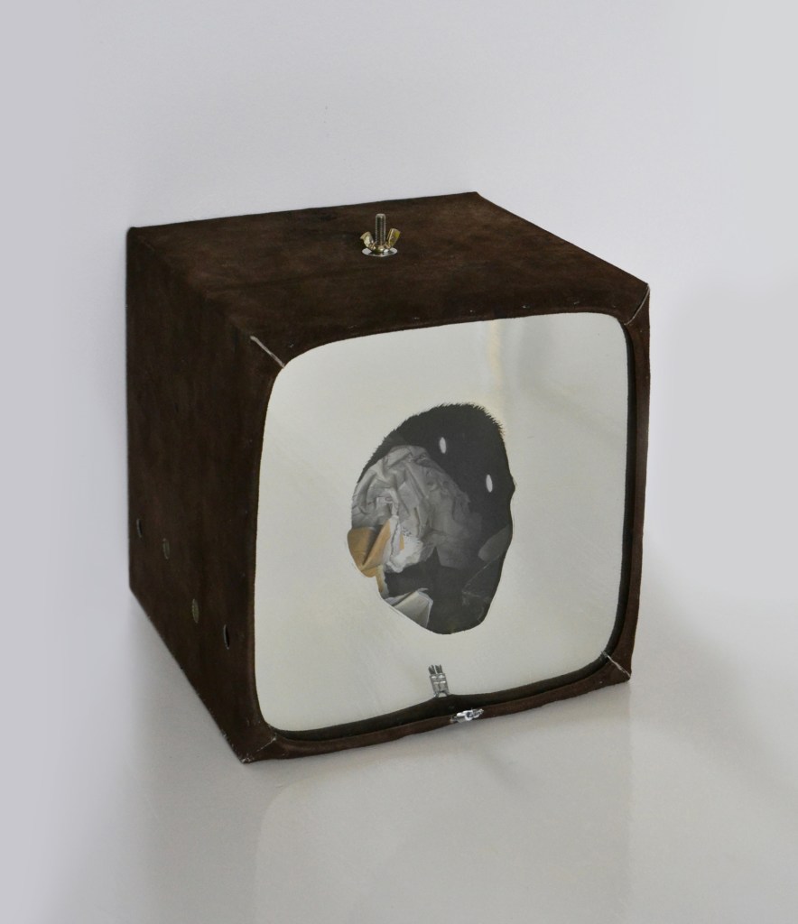 “Failed idea(L)s”, is a cube that invites the viewer to interact with an image that leads beyond the reflection of the mirror mounted on the front of the sculpture. The elements inside the box consist of a fake paper test, etched mezzotint plate, and torn drawings that were originally mounted on the scribbled mirrors, all crumpled. I use the sculpture as a default profile image box to bind the experience of perceiving objects, scenes, and events with the immediate vicinity, referencing a process that grafts altered personal memories with unexpected happenings.