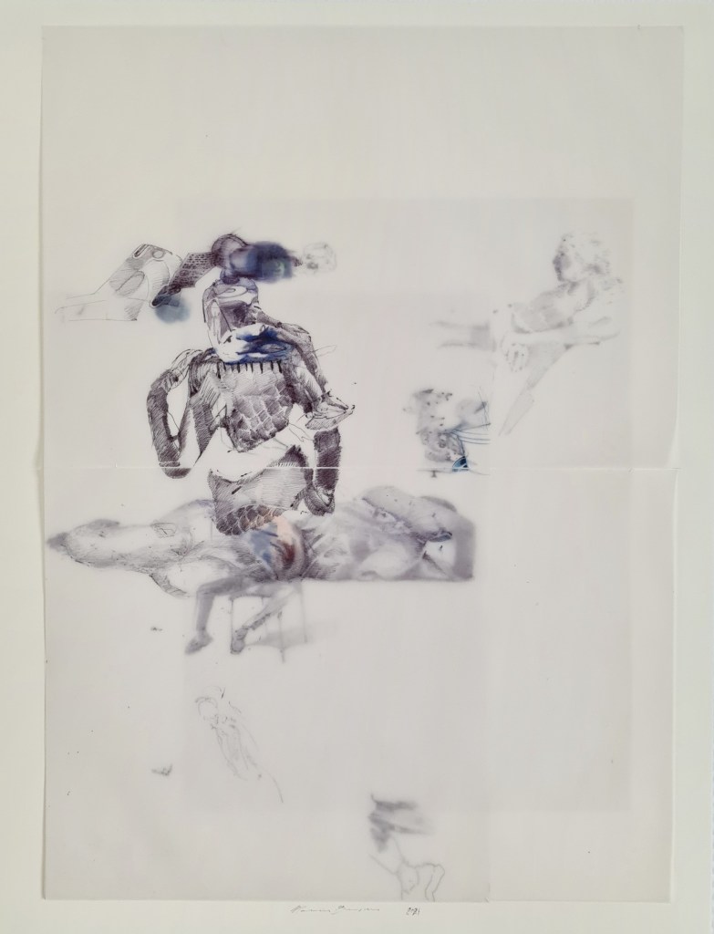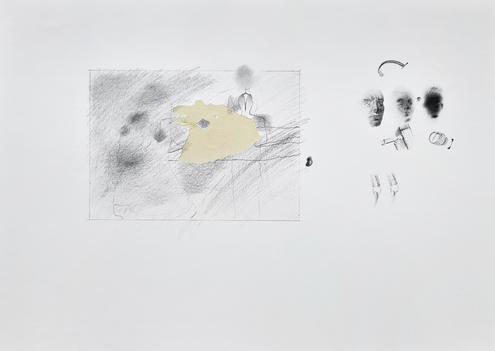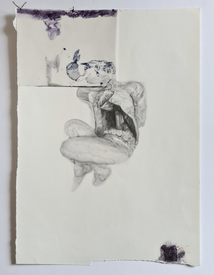 Study after Inflated Hybrid State Experience | 2022 | exfoliated layer from the painting “__ad __at __ fingers had __it__“, and pencil on paper | 29,7 x 42 cm