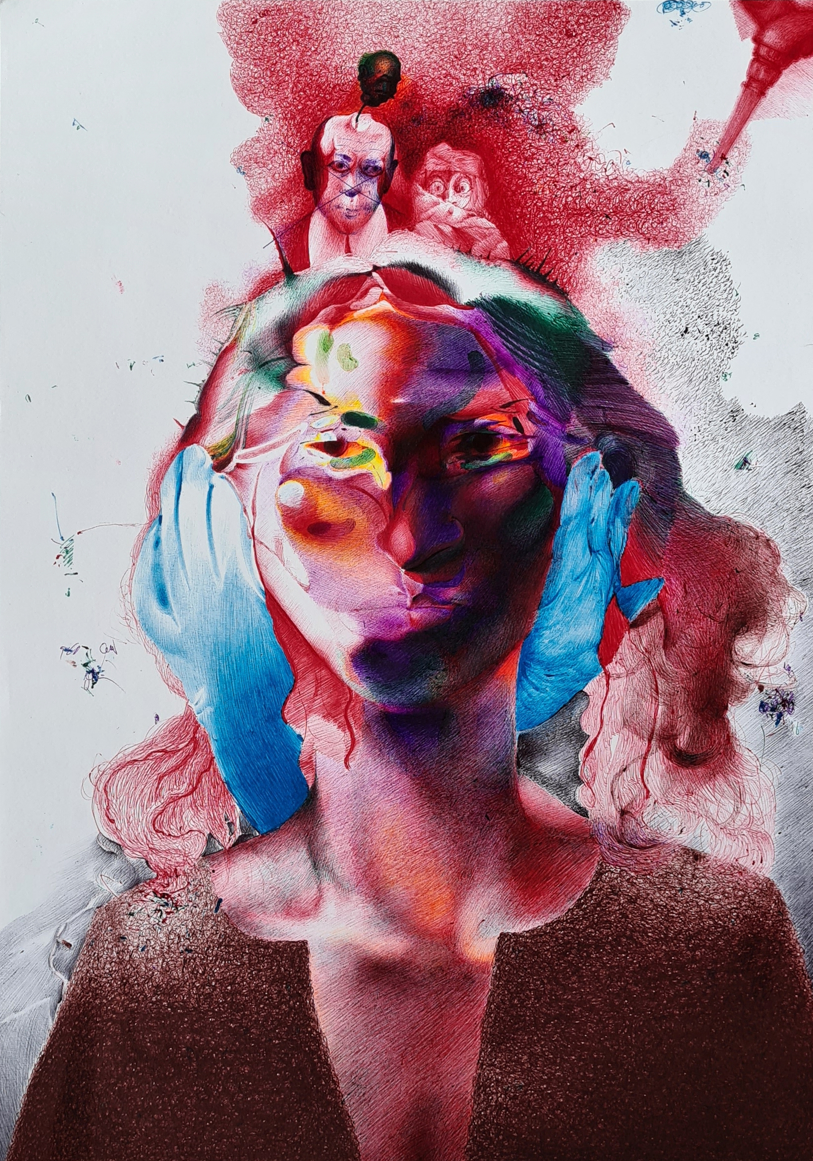 Depleted of Meaning | 2024 | ballpoint pen, ink, oil paint, carbon on paper | 42 x 29,7 cm