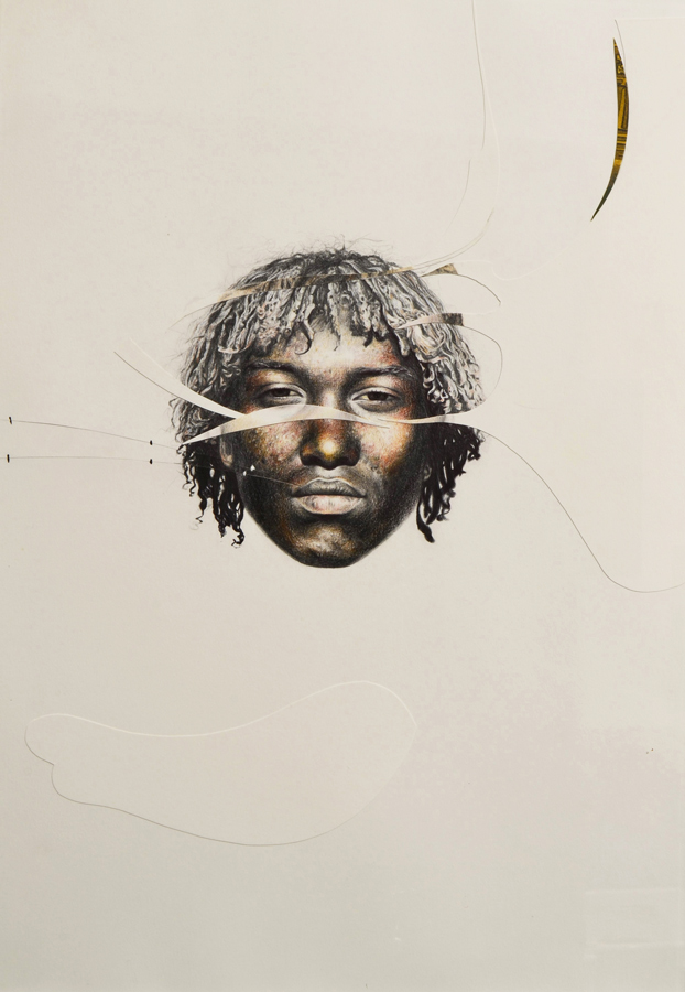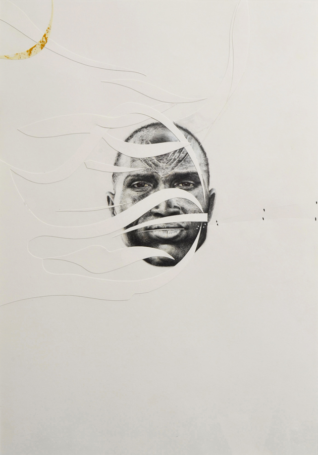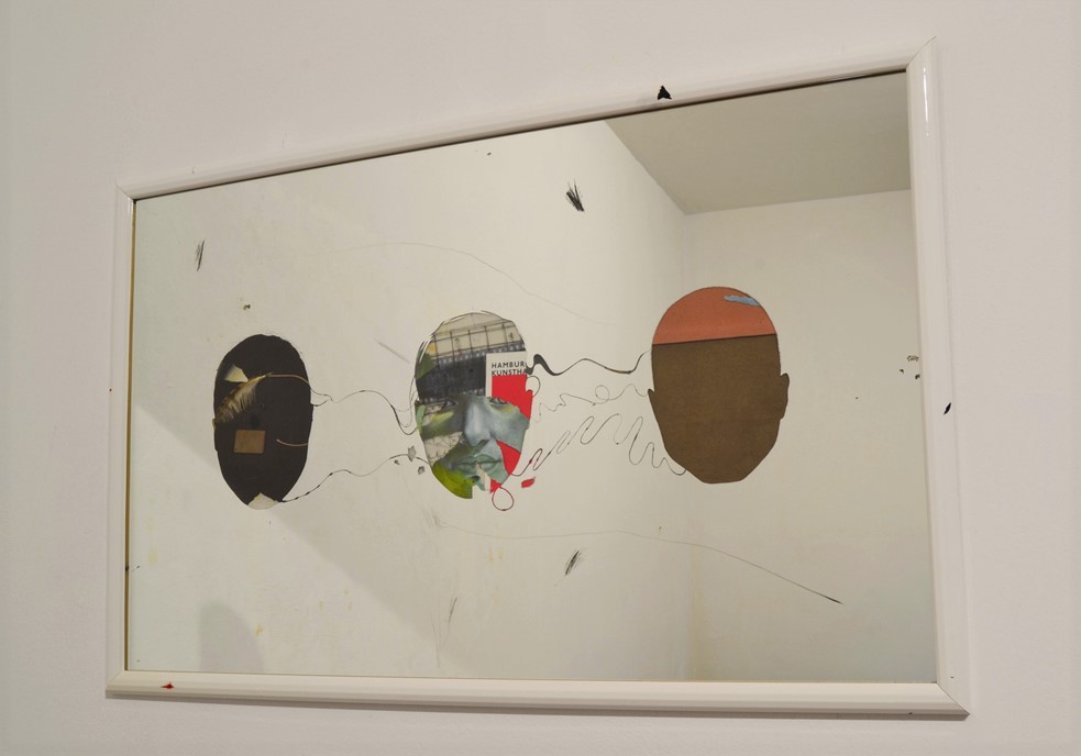 Citizen X | 2020 | drawing mounted under mirror, leather, acrylic, and oil on canvas | 60 x 50 cm
