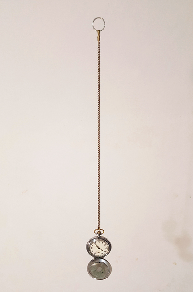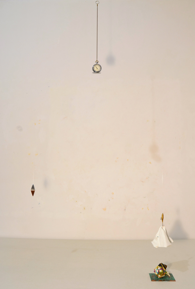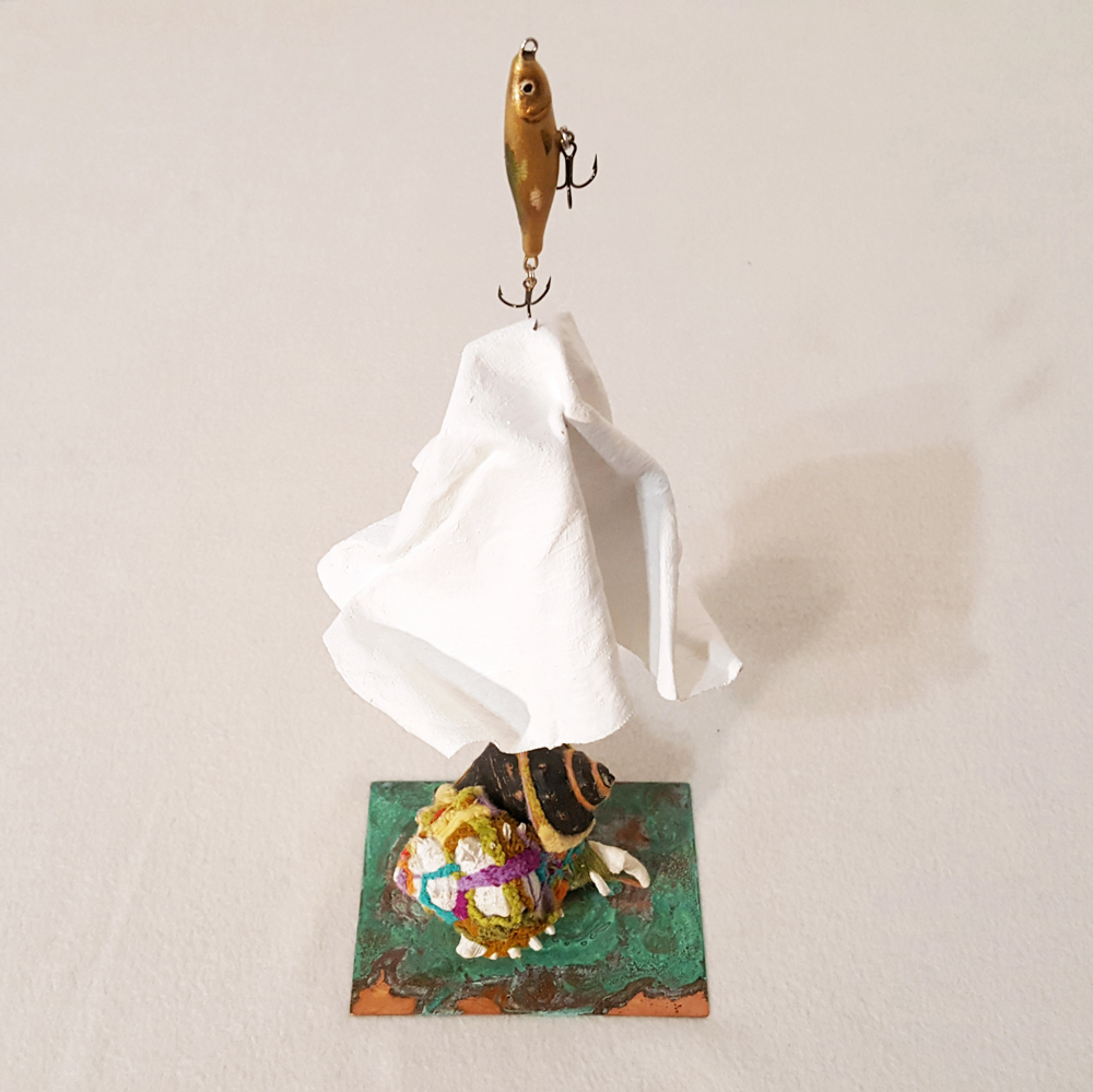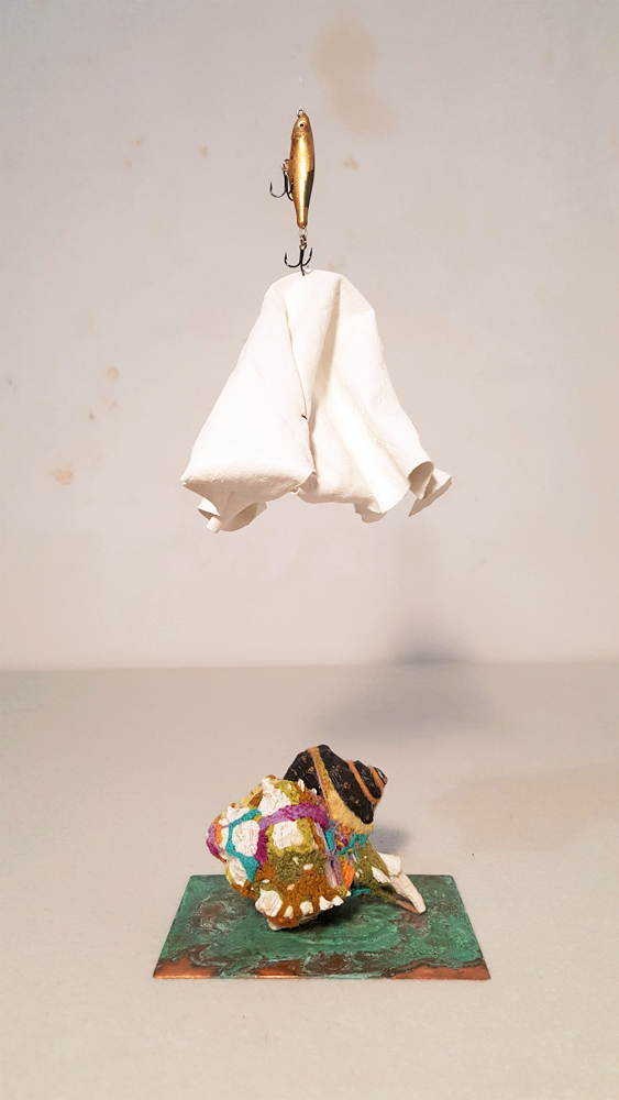 Unveiling the Veil | 2019 | copper, iron, fishing line, pocket watch, wobbler, canvas, shells, wool thread | variable dimensions