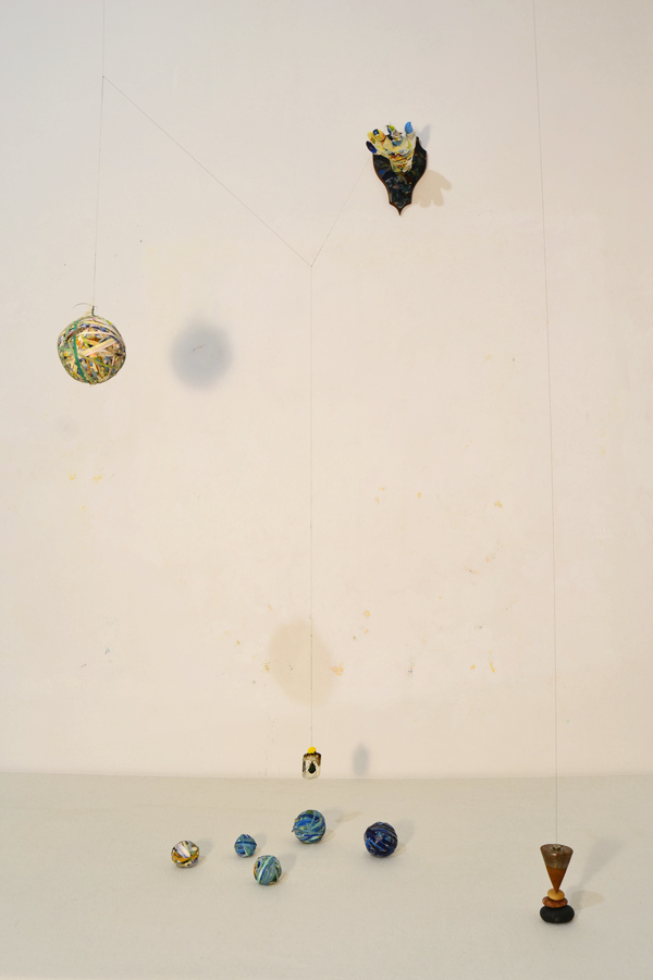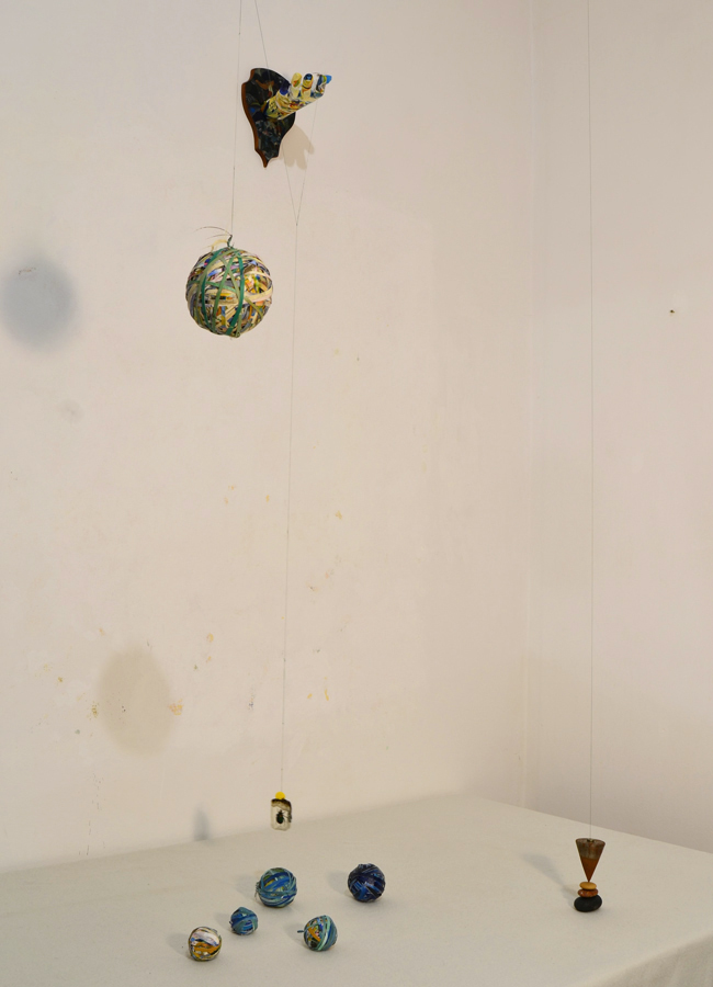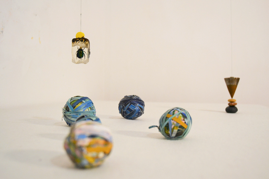 Pressure Points | 2017-2020 | scarab in resin, plastic, fishing line, iron plumb bob, stones, balls of canvas stripes from sectioned paintings, (section c)