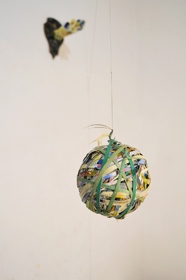 Pressure Points | 2017-2020 | artificial fly, fishing line, ball of canvas strips from sectioned painting, (section a)