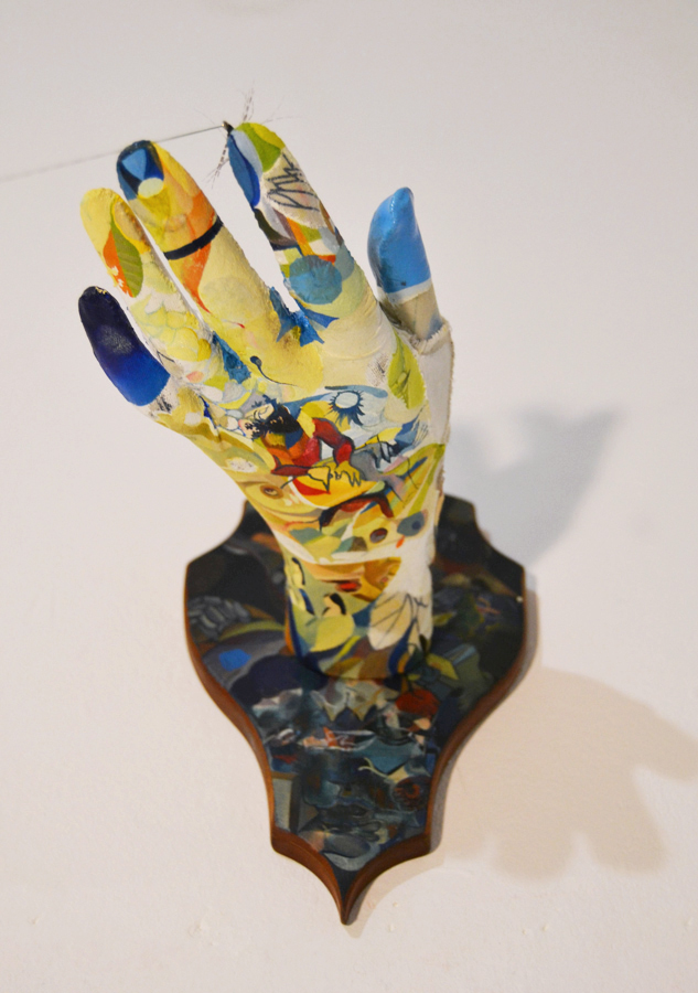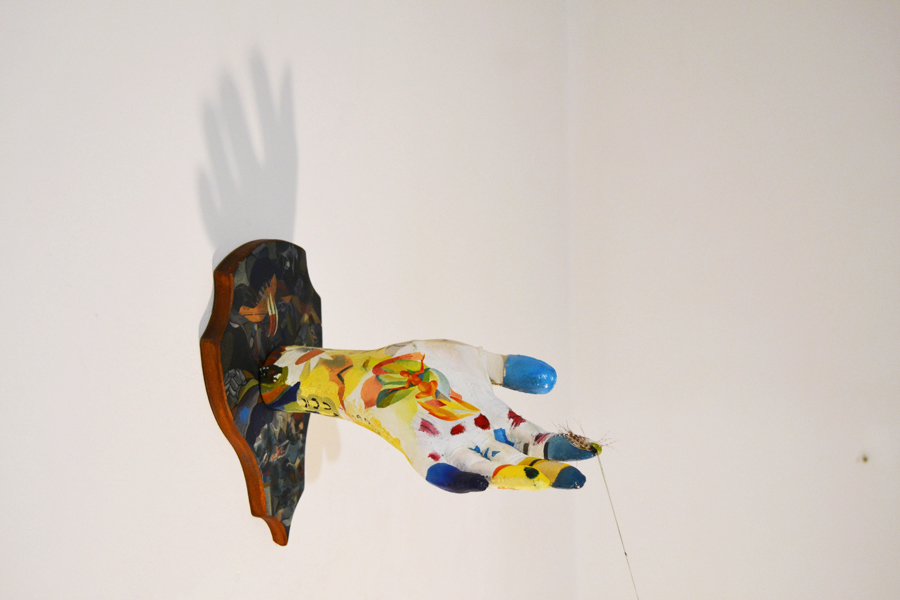 Pressure Points | 2017-2020 | Artificial fly, fishing line, mannequin hand covered with painted canvas from a curtain, oil on taxidermy wood plate, the tip of the thumb is from a surgical glove. (section b)