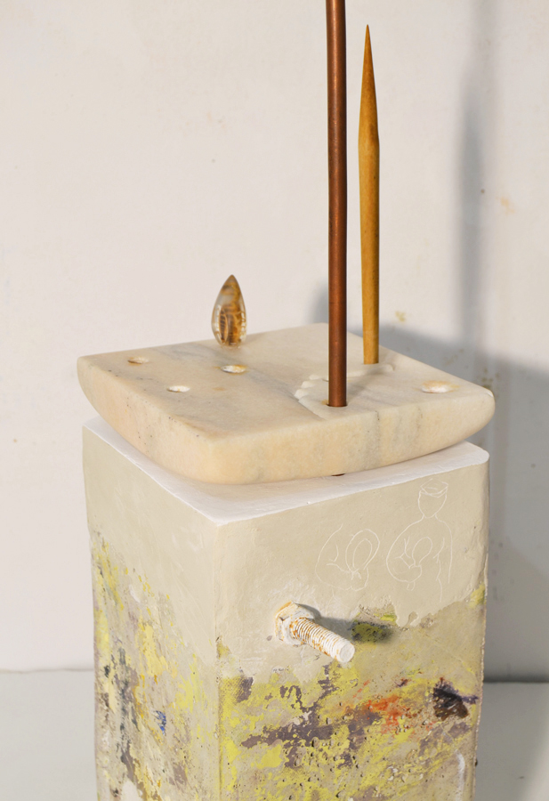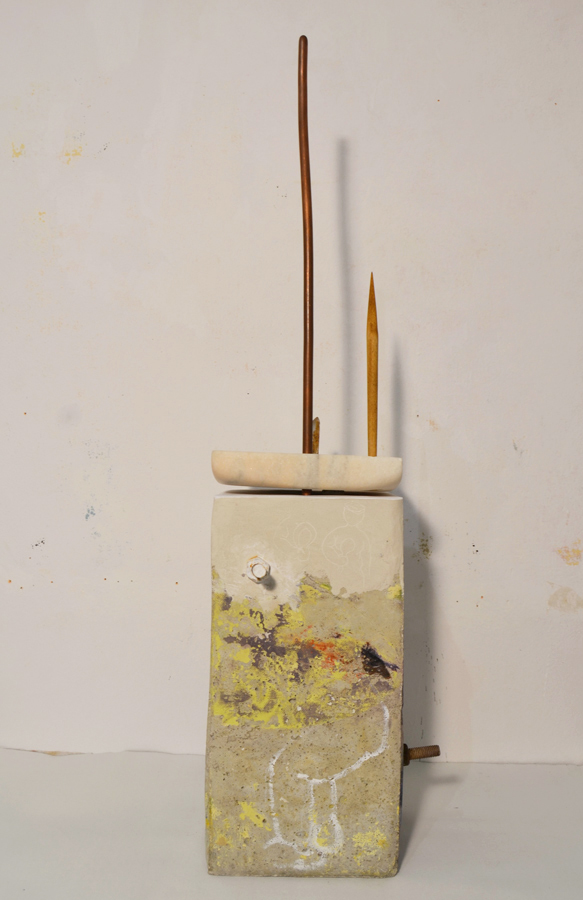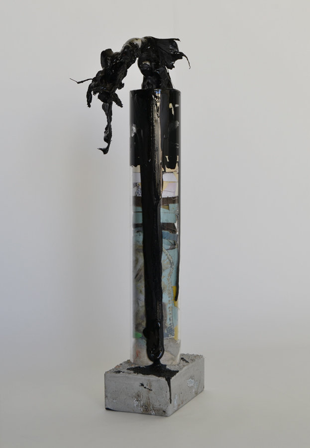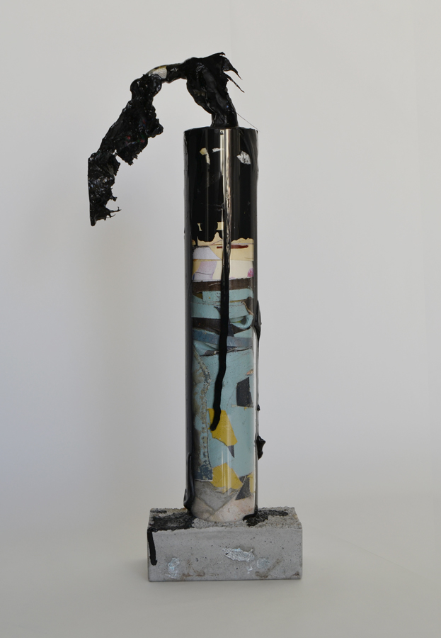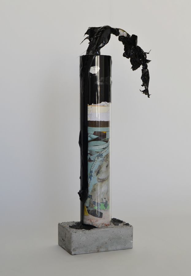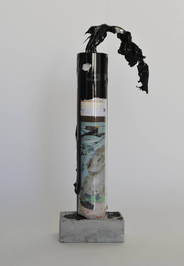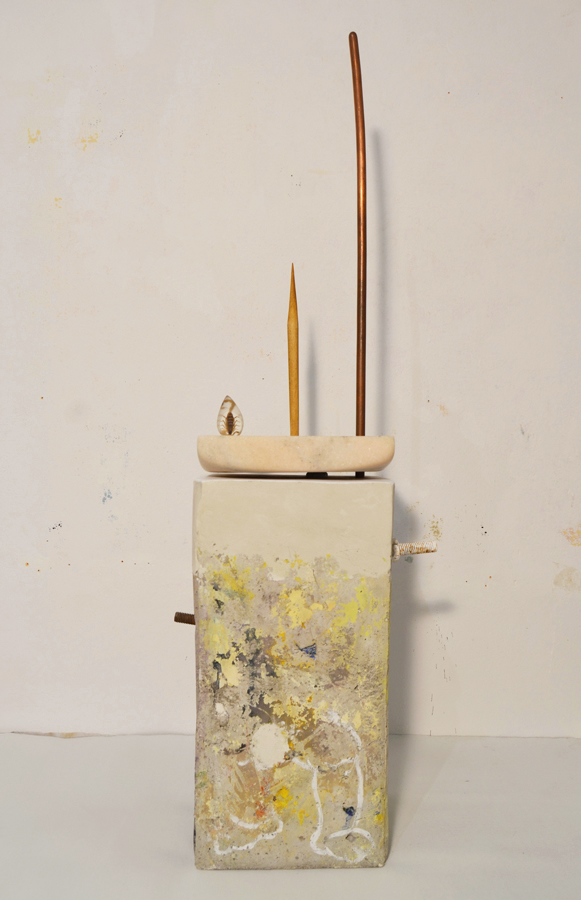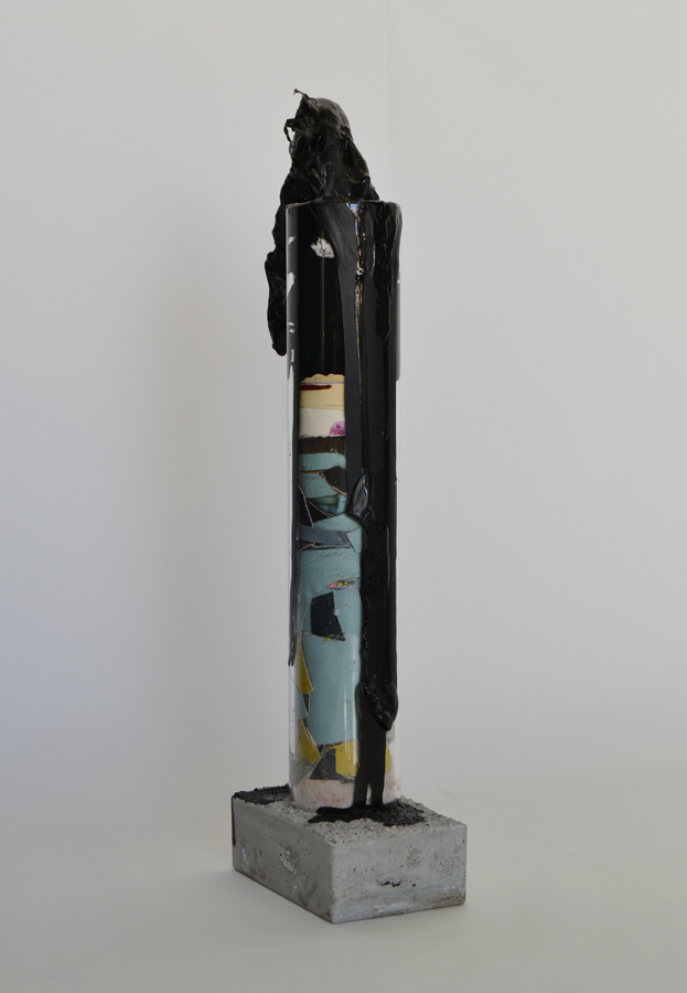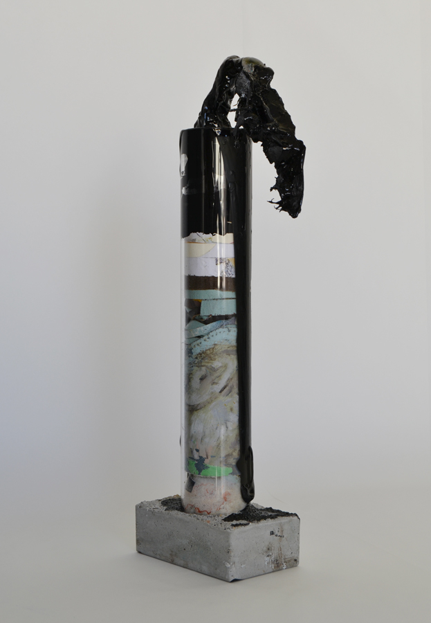 Sample #571 | 2023 | concrete, glass, metal, leather, segments of sectioned drawings and painting, cloth, wobbler, fishhook, and vinyl paint | 32,5 x 13 x 9 cm