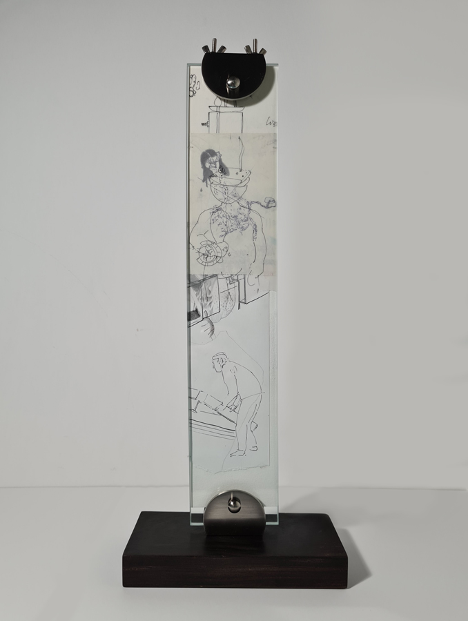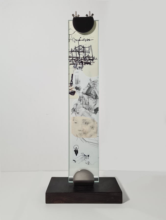 Hold Your Ears Close to Your Bed | 2022 | wood, metal, glass, and drawings | 42 x 16 x 7.5 cm | A-side