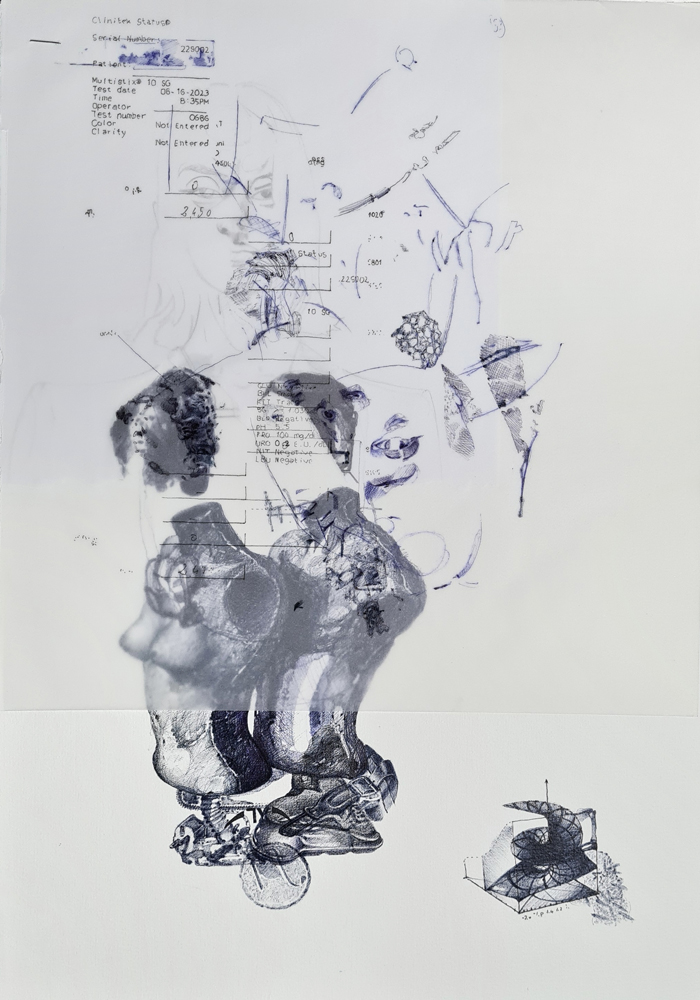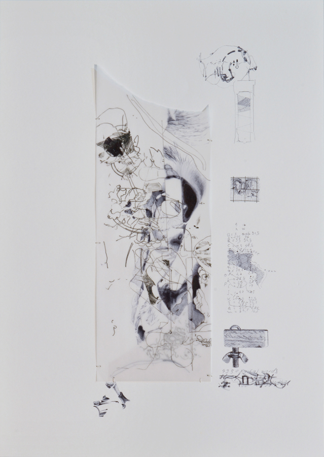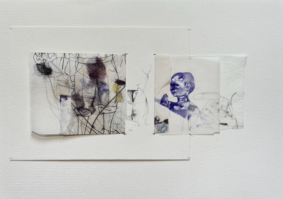 Depreciated Image | 2025 | ballpoint pen on paper, ink and cotton thread on translucent paper | 42 x 29.7 cm