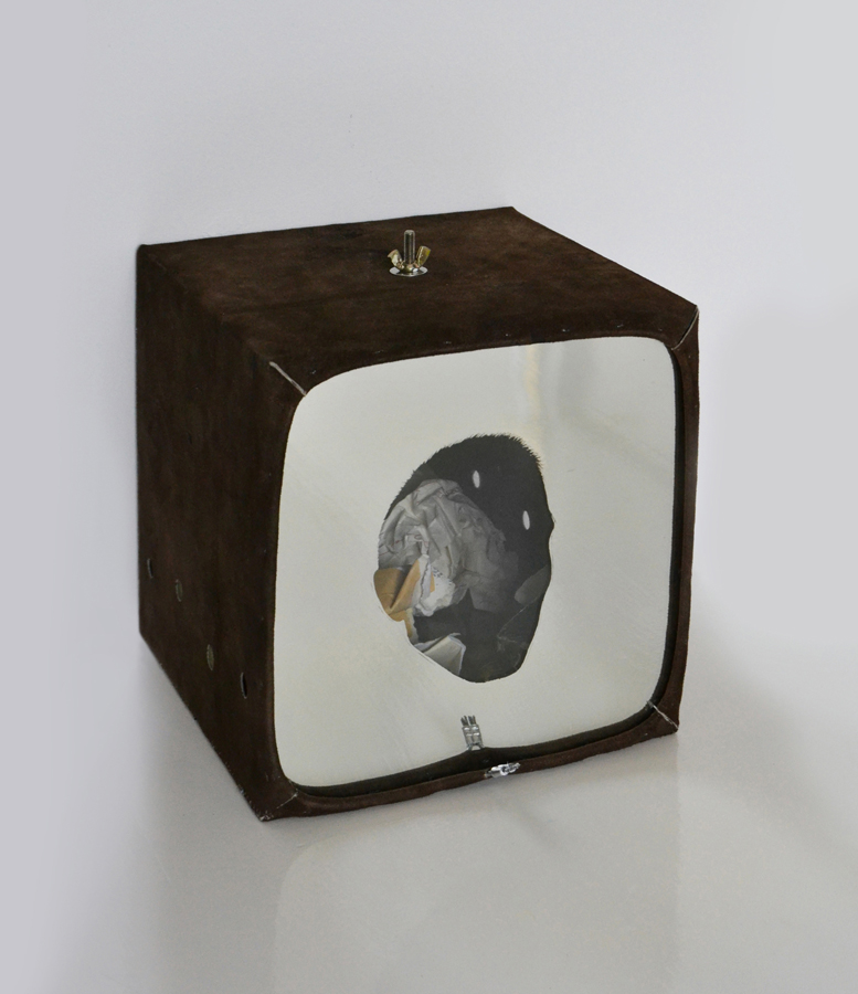 Failed IdeaLs | 2022 | mirrors, acrylic, leather, fishing line, copper, crumpled and torn drawings, screw, and nut | 22,2 x 20,2 x 22,5 cm