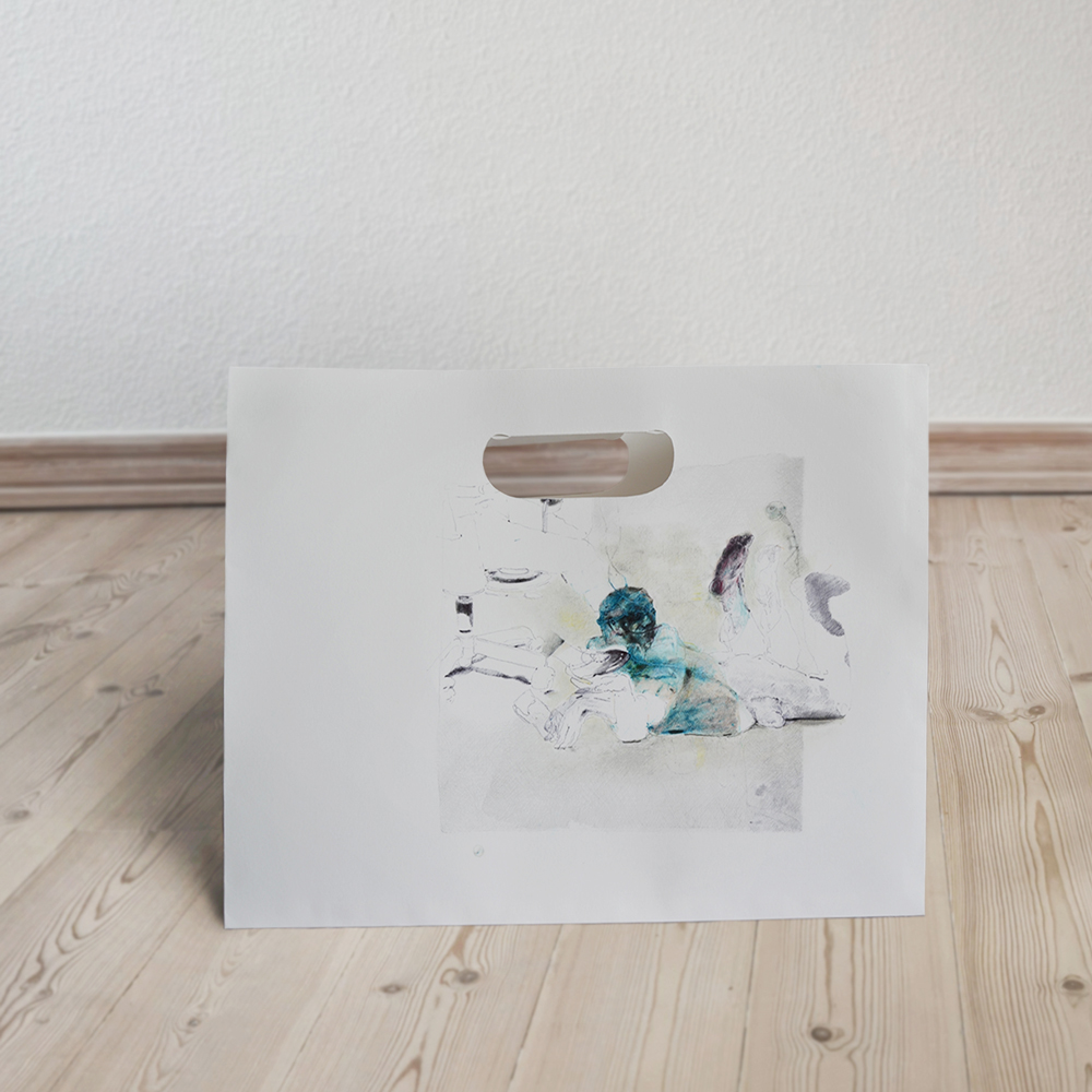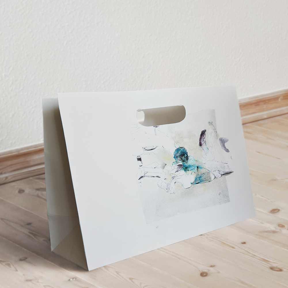 Ethos | 2023 | green carbon, ballpoint pen, pencils, colored pencils, and ink on a bag made out of paper | 29,8 x 40,8 x 16 cm